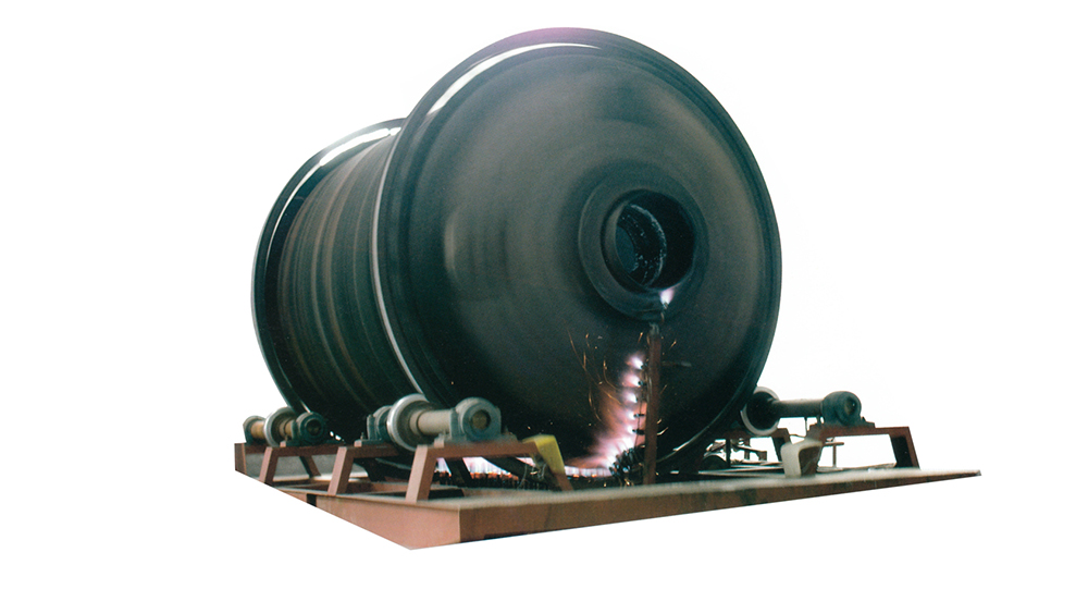 沿兩相互垂直的軸連接旋轉(zhuǎn),模具內(nèi)樹脂在重力和熱量的作用下逐漸均勻地涂面、熔融黏附于模具內(nèi)表面上,形成所需要
